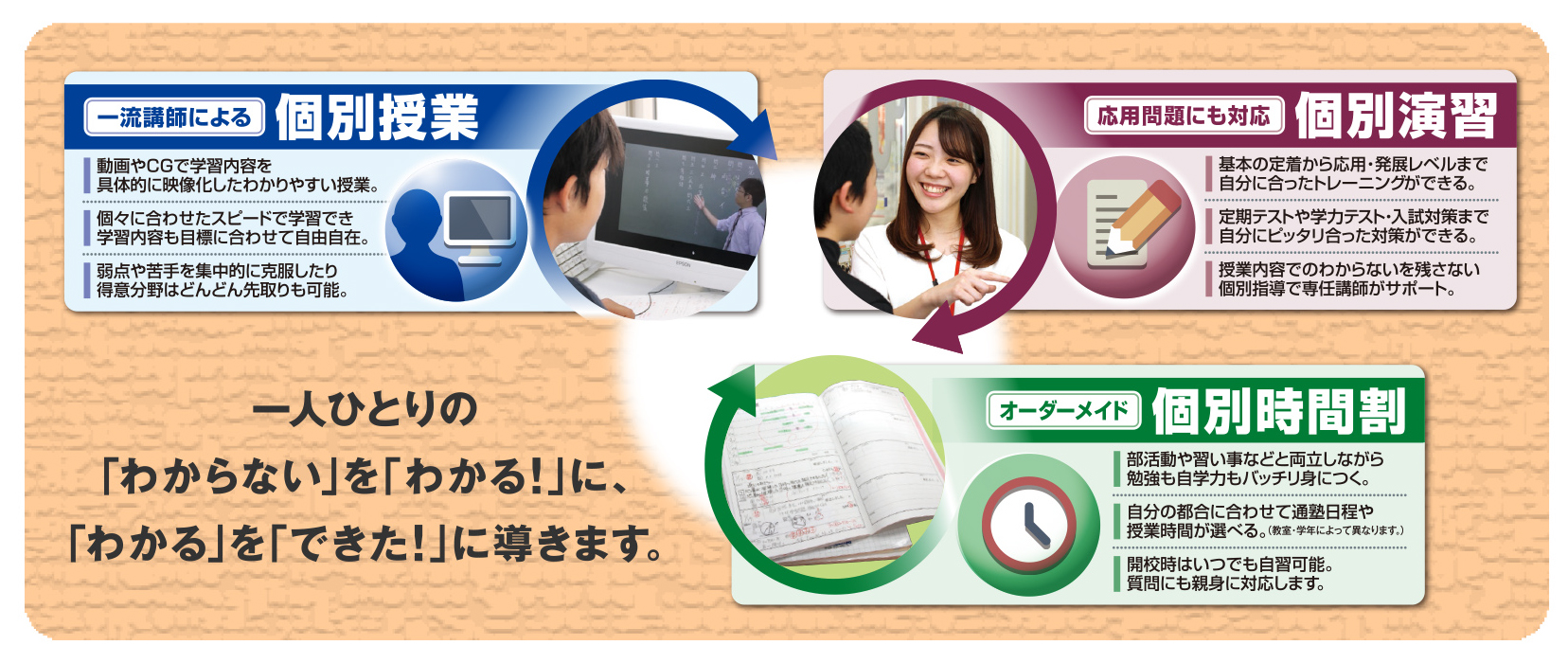 「3つの柱」は個別授業、個別演習、個別時間割。個別授業はよくわかる映像授業で理解力アップさせ、個別演習は質の高い演習で定着力アップ、個別時間割は部活動や習い事との両立もできるように自分に合った通塾曜日を選択し、しっかり実力をつけていきます。