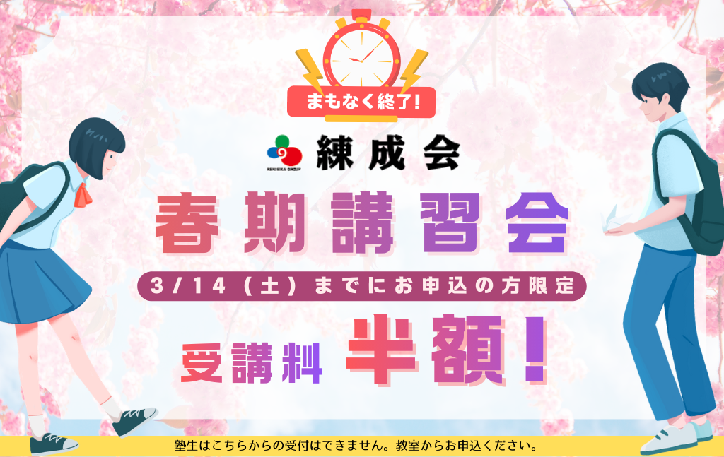 お知らせ INFORMATION 重要なお知らせ 2026/02/25 ■新年度の授業時間について 当サイトに掲載されているのは2025年度の授業時間です。新年度の授業時間についてはお知らせ記事よりご確認ください。 詳しくはこちら 2026/03/04 ニュース 中学生 【2026年度】3月4日(水)最新版!北海道公立高校入試予想ボーダー 2026/03/03 ニュース 小学生 中学生 【第3回】2026年 全道チャレンジテストの合格者を発表!! 2026/03/03 イベント 小学生 【年長-小5(新小1-新小6)】3月|プロクラ・親子無料体験会のご案内 もっとみる 授業のご紹介 COURSE 小学生 中学生 高校生 教室のご案内 SCHOOLS 小・中学生 集団指導 小・中学生 個別指導 高校生 教室案内 実績 RESULTS 小学生 中学生 高校生 塾生・保護者の声 VOICE 練成会【集団指導】 超個別指導 練成会PLUS 東進衛星予備校 よくある質問 無料体験