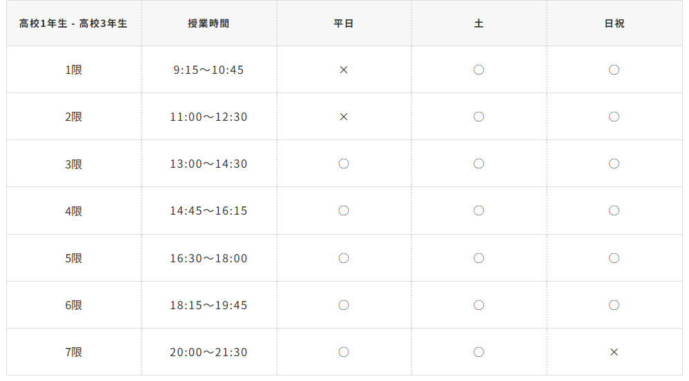 | 火・水・木・金 | ① 16:50~17:40 ② 17:50~18:40 ③ 18:50~19:40 ④ 19:50~20:40 ⑤ 20:50~21:40 |
