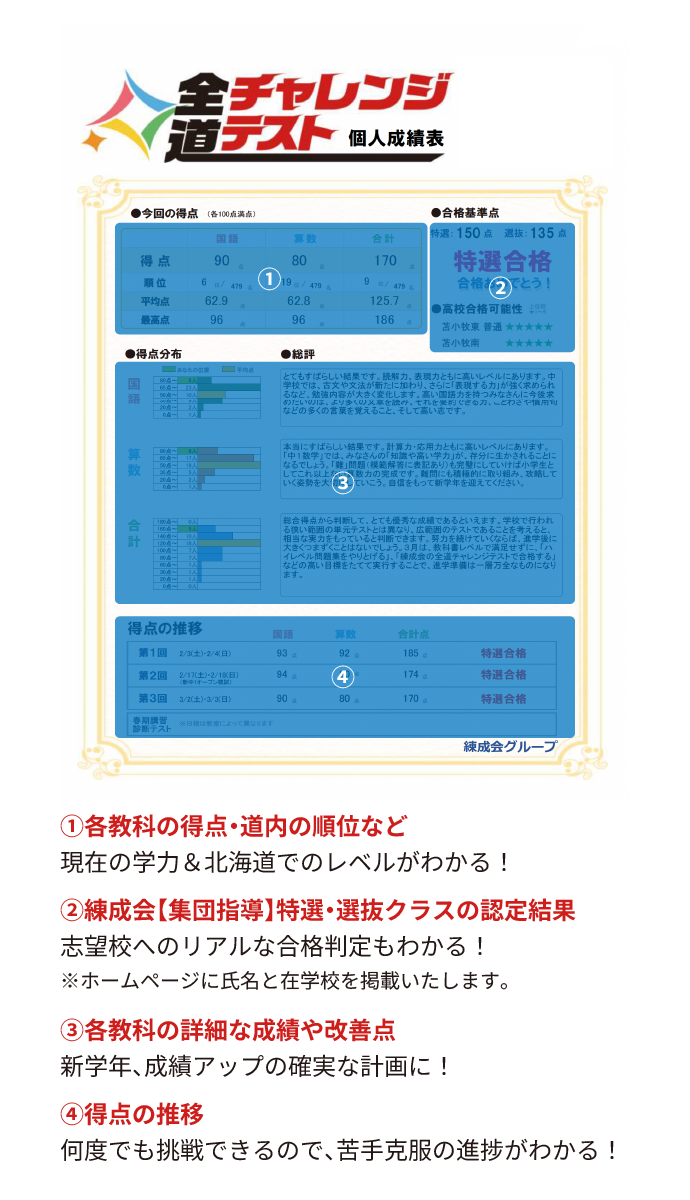 - ※練成会の「特選クラス」「選抜クラス」の参加資格となる基準点数に到達している方には、その旨もお知らせいたします。