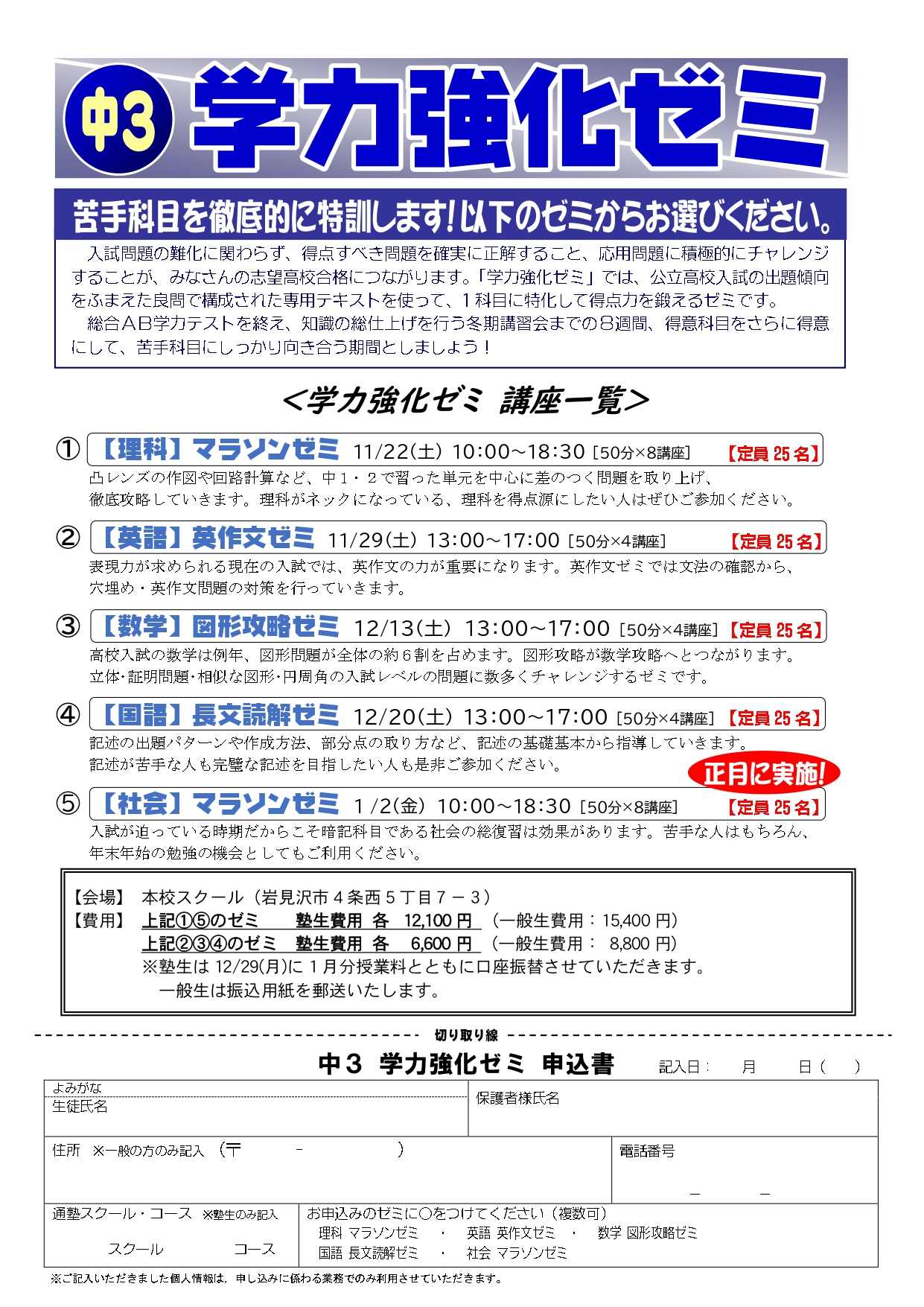 岩見沢練成会では、11~1月にかけて各科目の特別講座『学力強化ゼミ』を行います。
