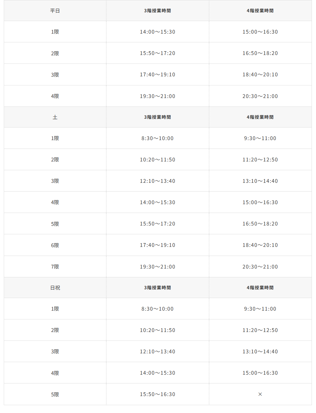 | 火・水・木 | ① 16:50~17:40 ② 17:50~18:40 ③ 18:50~19:40 ④ 19:50~20:40 ⑤ 20:50~21:40 |