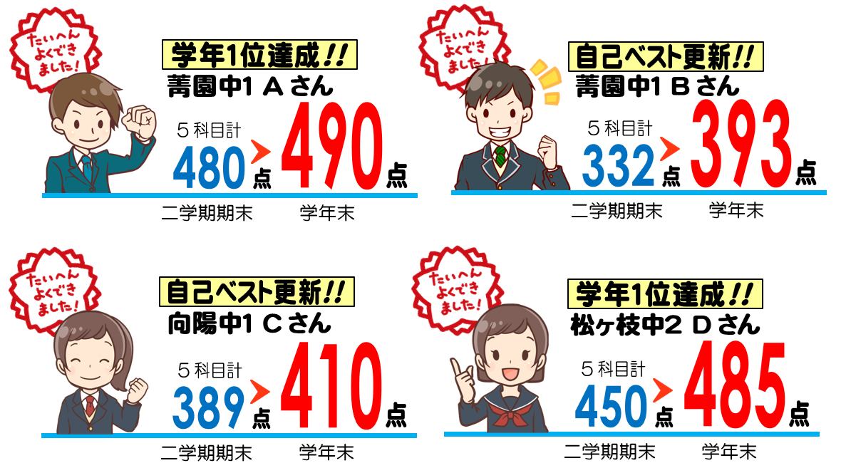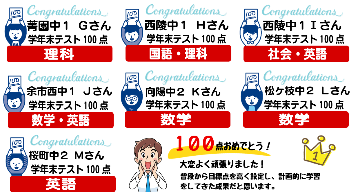 皆さん、こんにちは!小樽本校スクールの西川です ! 雪がとけ、暖かくなってきました。もうすぐ、春がやってきますね。 今回は2月上旬から下旬にかけて実施された学年末試験(中1~2)の成果をお伝えします。 今回もよく頑張ってくれました!その頑張りの一部を紹介します。
