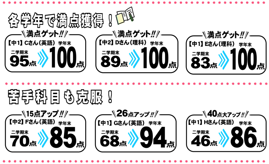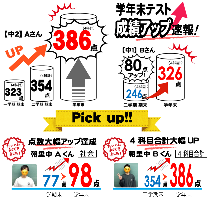 こんにちは。朝里スクール教室長の穗積です。 2/17(月)に行われた学年末試験の結果速報になります。 定期テスト成功に向けて、学校ワークや練成会の教材をできるようになるまで何週も解いていました。 朝里スクールの塾生の頑張りをこの後に載せているのでぜひ、ご覧になってください!