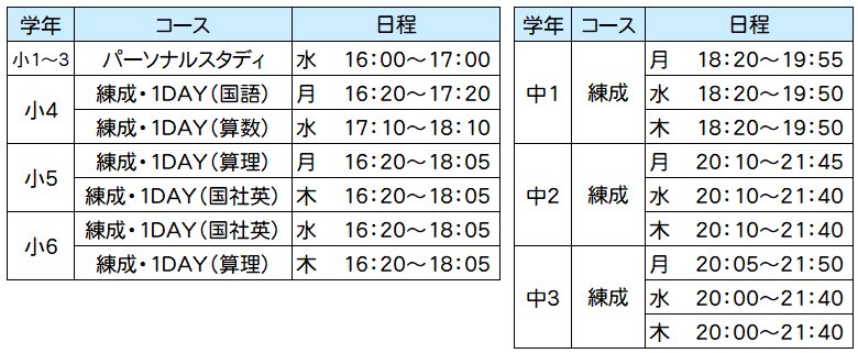 新学年通常授業 時間割のご案内(朝里スクール)