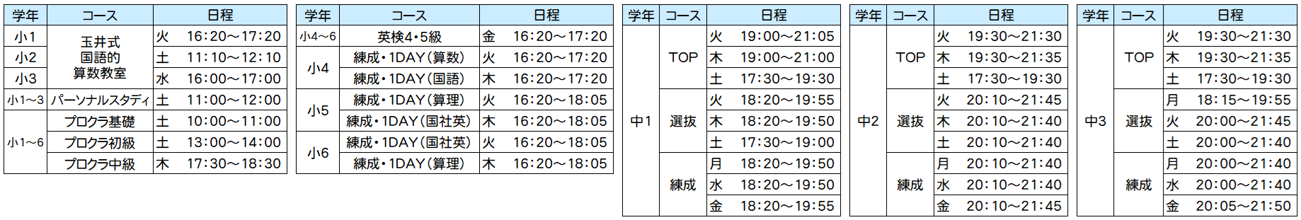 新学年通常授業 時間割のご案内(本校スクール)