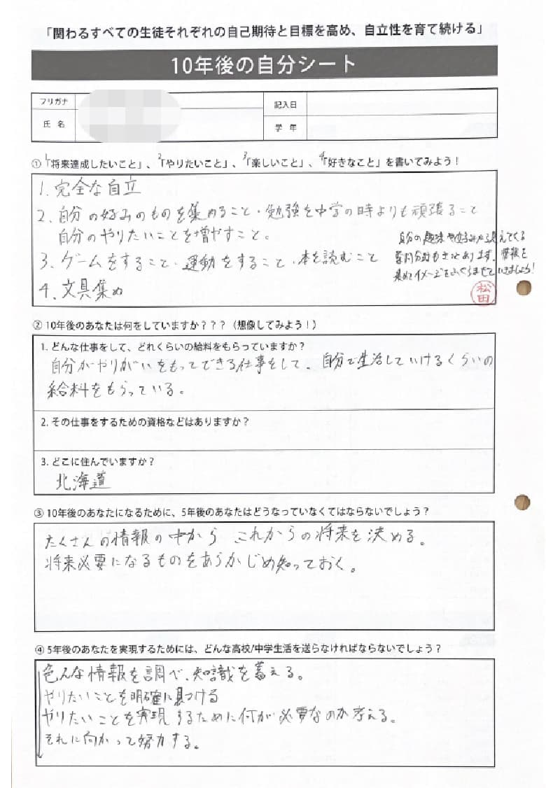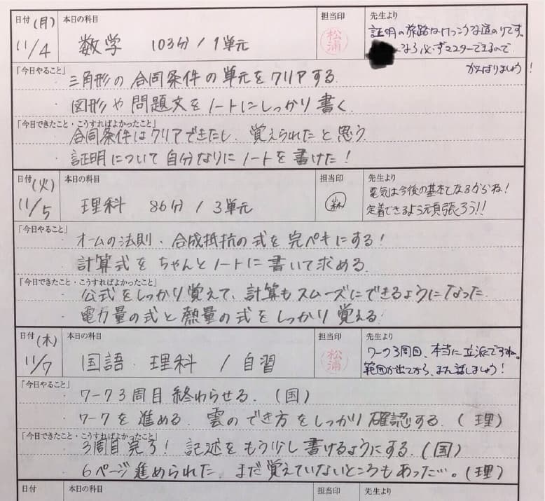 現状に満足せず向上を目指している生徒さんで、面談では結果でなく、そこまでの取り組みを承認するよう意識しています。