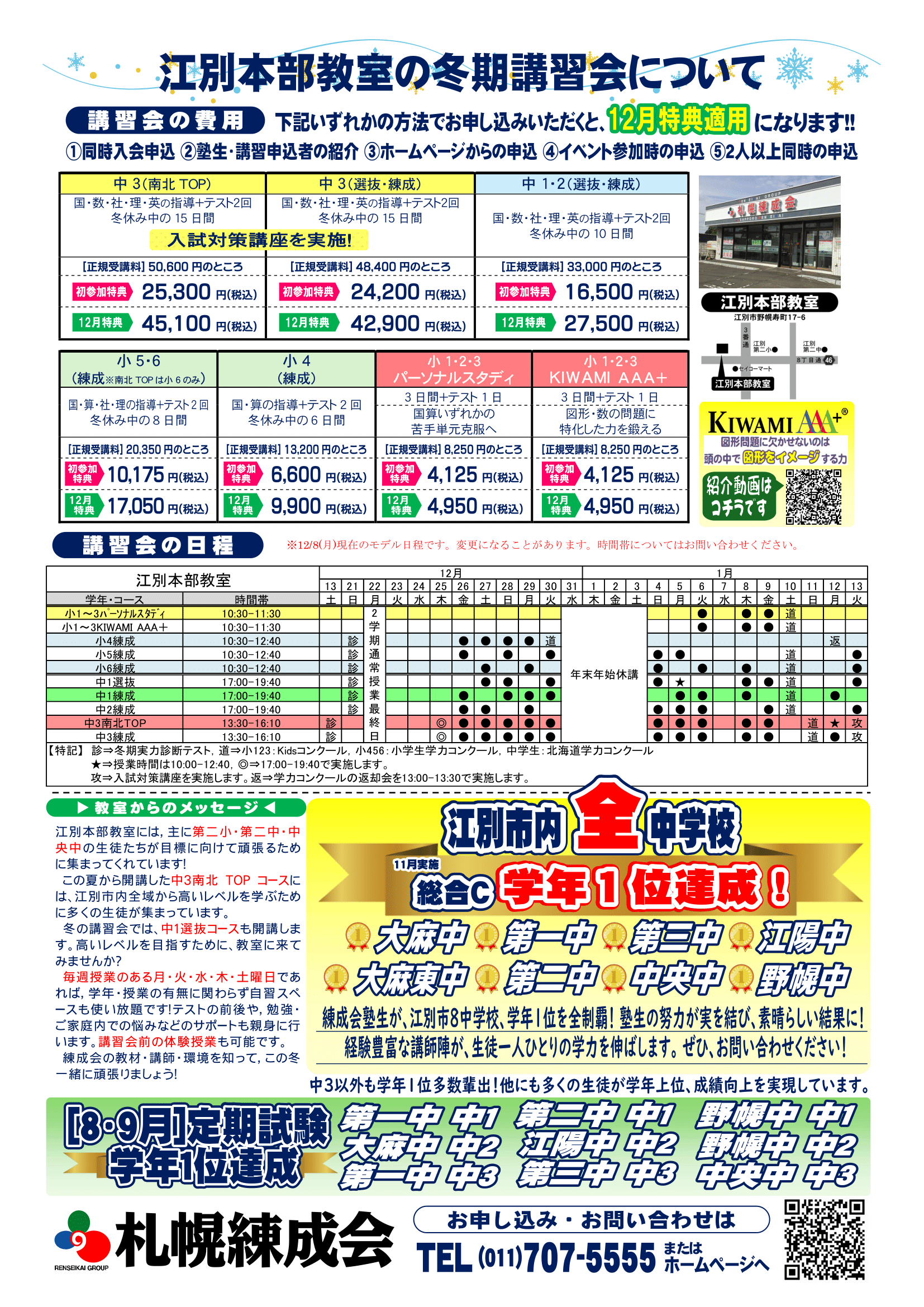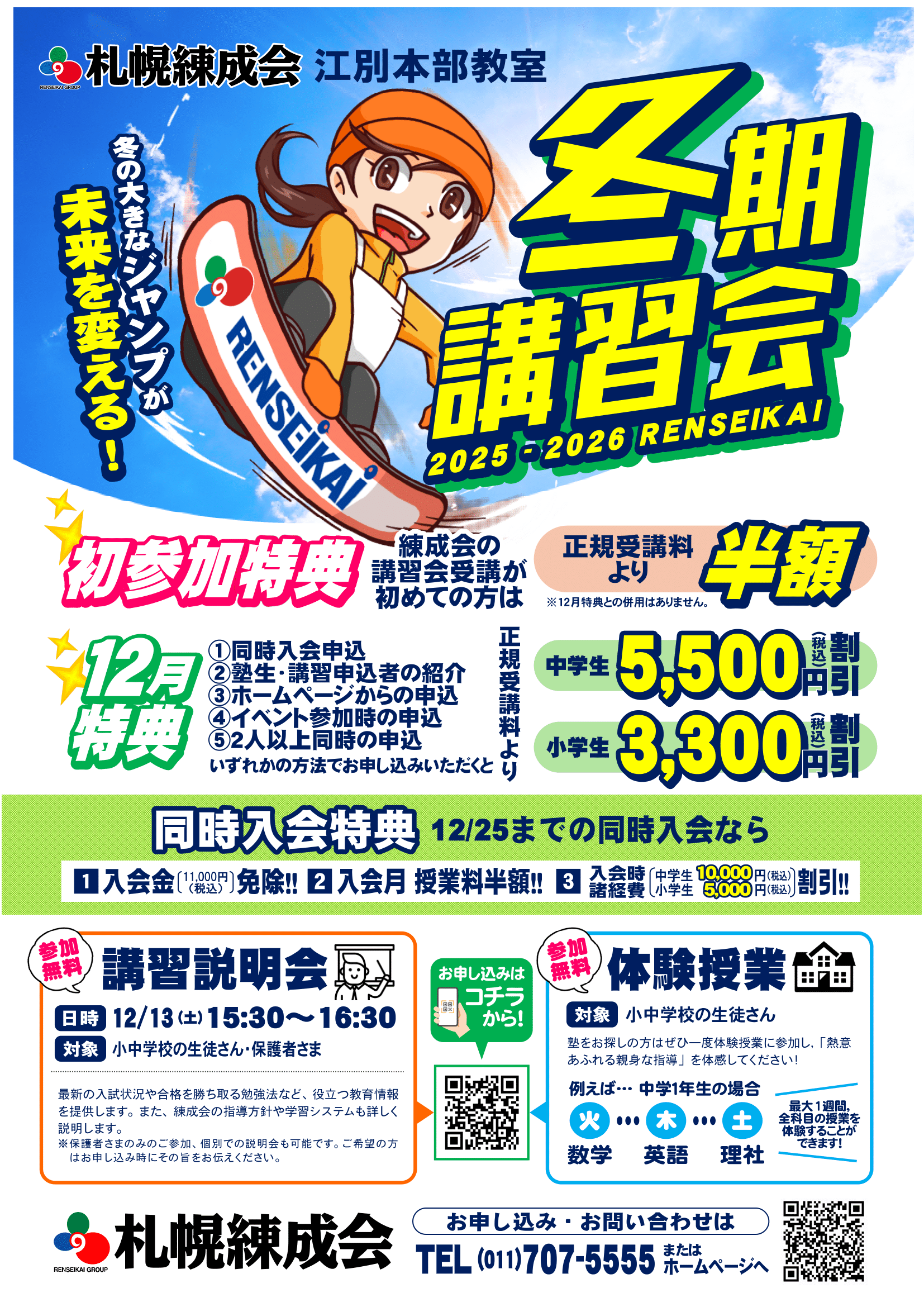 江別に来て2年目の冬、雪の多さに😲ビックリ😲しているこの頃ですが、もうすぐ、冬休みですね。