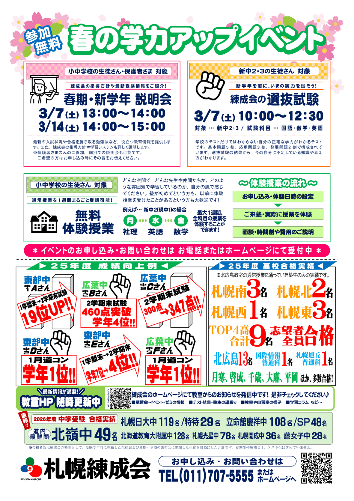 札幌練成会の春期講習会では北海道学力コンクールをカリキュラムに組み込んでおり、