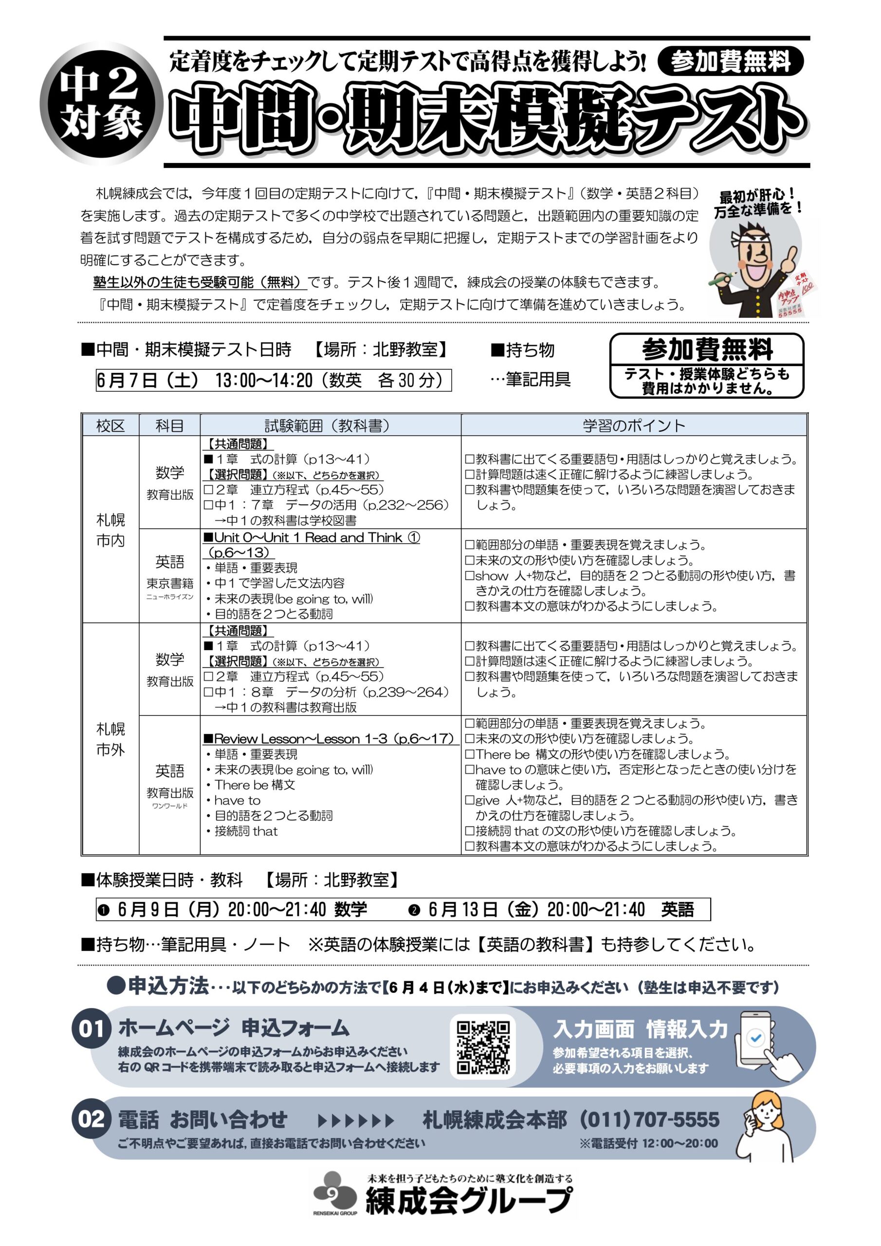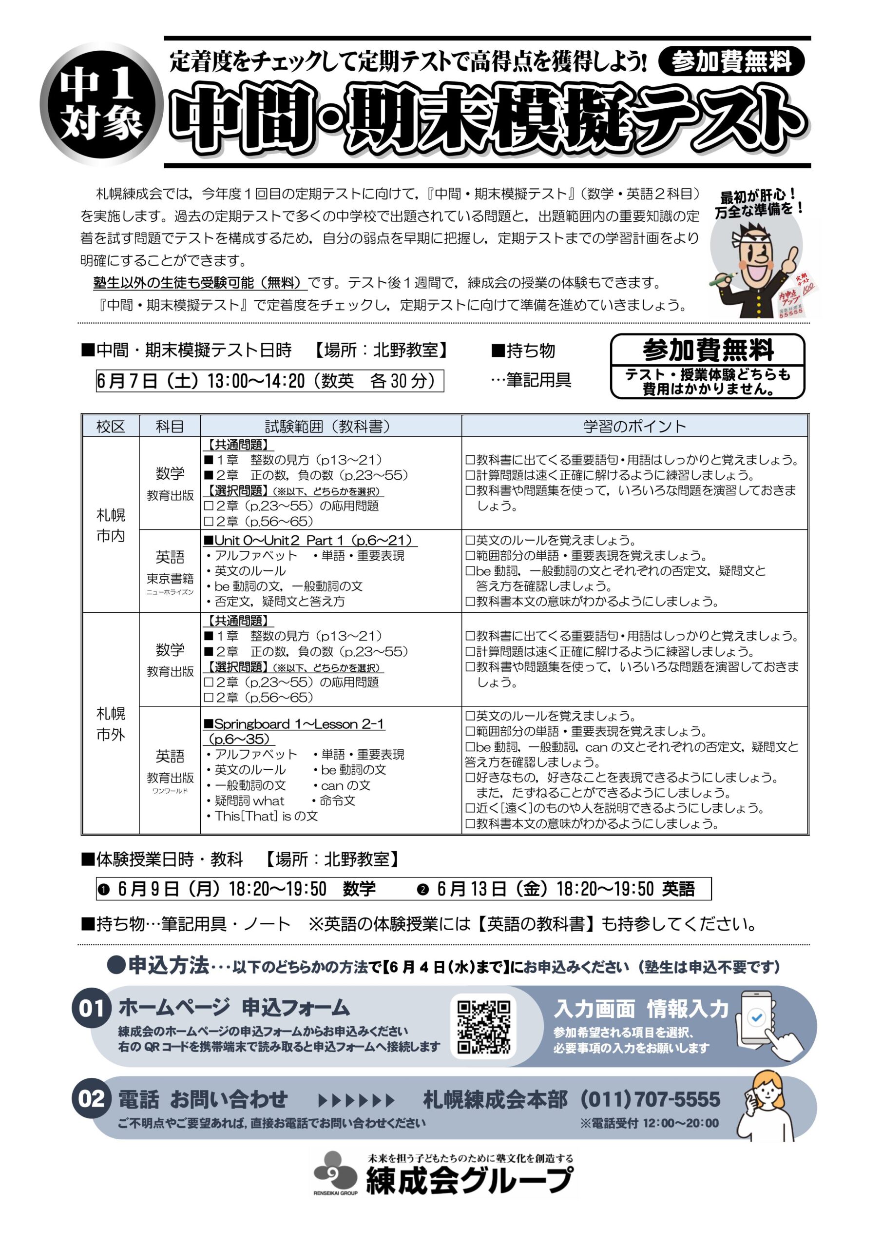 【中1・2対象】中間・期末模擬のご案内(北野教室)