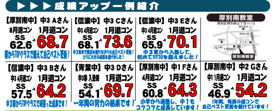 今の中3塾生は、厚別南中・信濃中・厚別中・もみじ台中・日章中・日大中・江別第二中など、幅広くの中学校から通塾をしていただき、入試本番に向けて緊張感をもって取り組んでくれています。