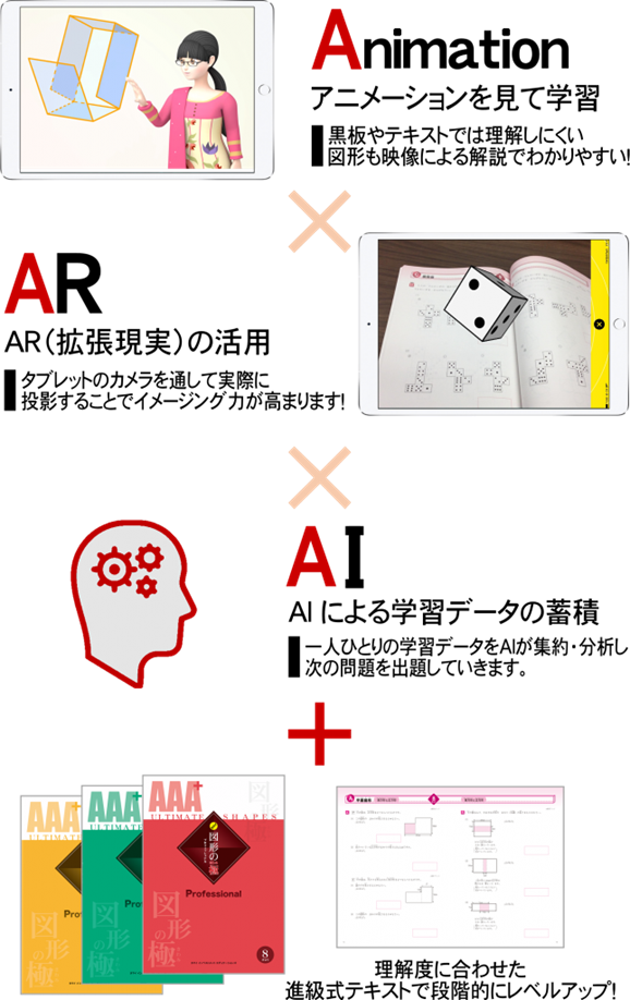 紙面だけではイメージの沸きにくい問題もアニメーションで見ることによって、自分の頭の中で図形を組み立てることができるようになり、直感的に図形をイメージすることができる力を磨いていきます。