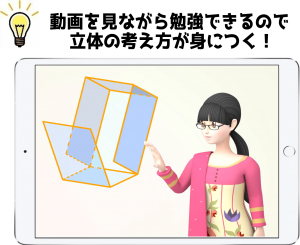 紙面だけではイメージの湧きにくい問題もアニメーションで見ることによって、自分の頭の中で図形を組み立てることができるようになり、直感的に図形をイメージすることができる力を磨いていきます。