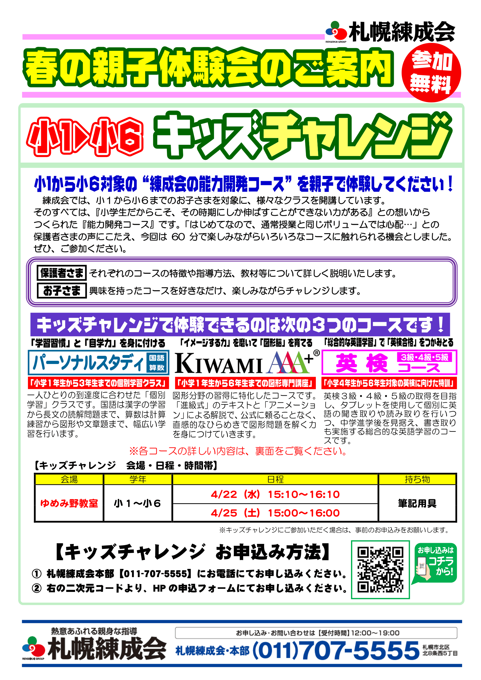 【小1-小6対象】楽しく学ぶ!春の親子体験会(ゆめみ野教室)