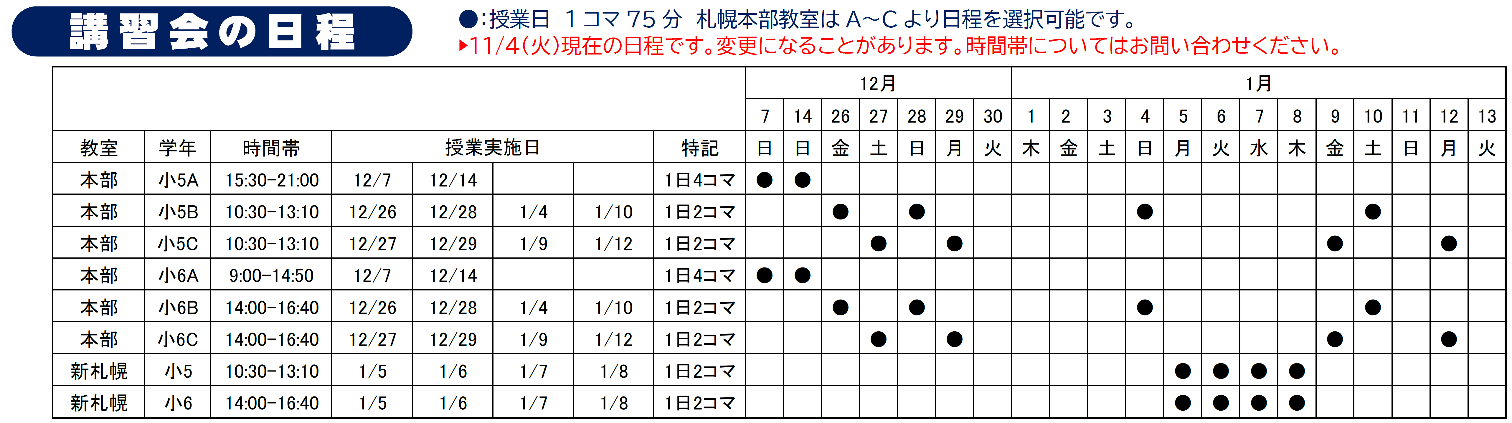 ただしお席の関係上,各日程(クラス)は定員30名となりますので,11月中にお早めにお申し込みください。