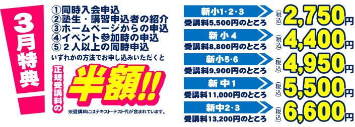 以下の条件のいずれかを満たすお申込みで、春期講習会正規受講料より全学年 半額 !!