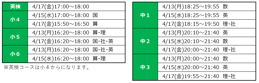 小学生・中学生の通常授業、さらには英検コースまでの体験が可能です。