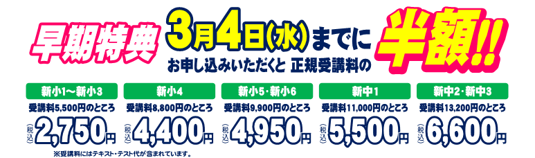 3/4(水)までのお申込みで、春期講習会正規受講料より