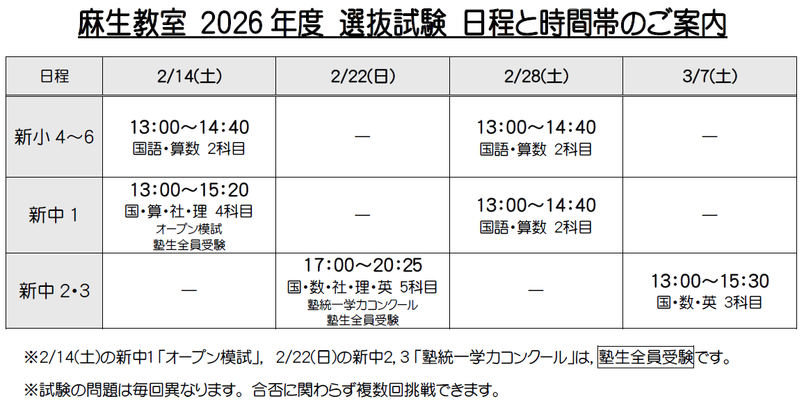 麻生の選抜試験の日程については以下の通りです。