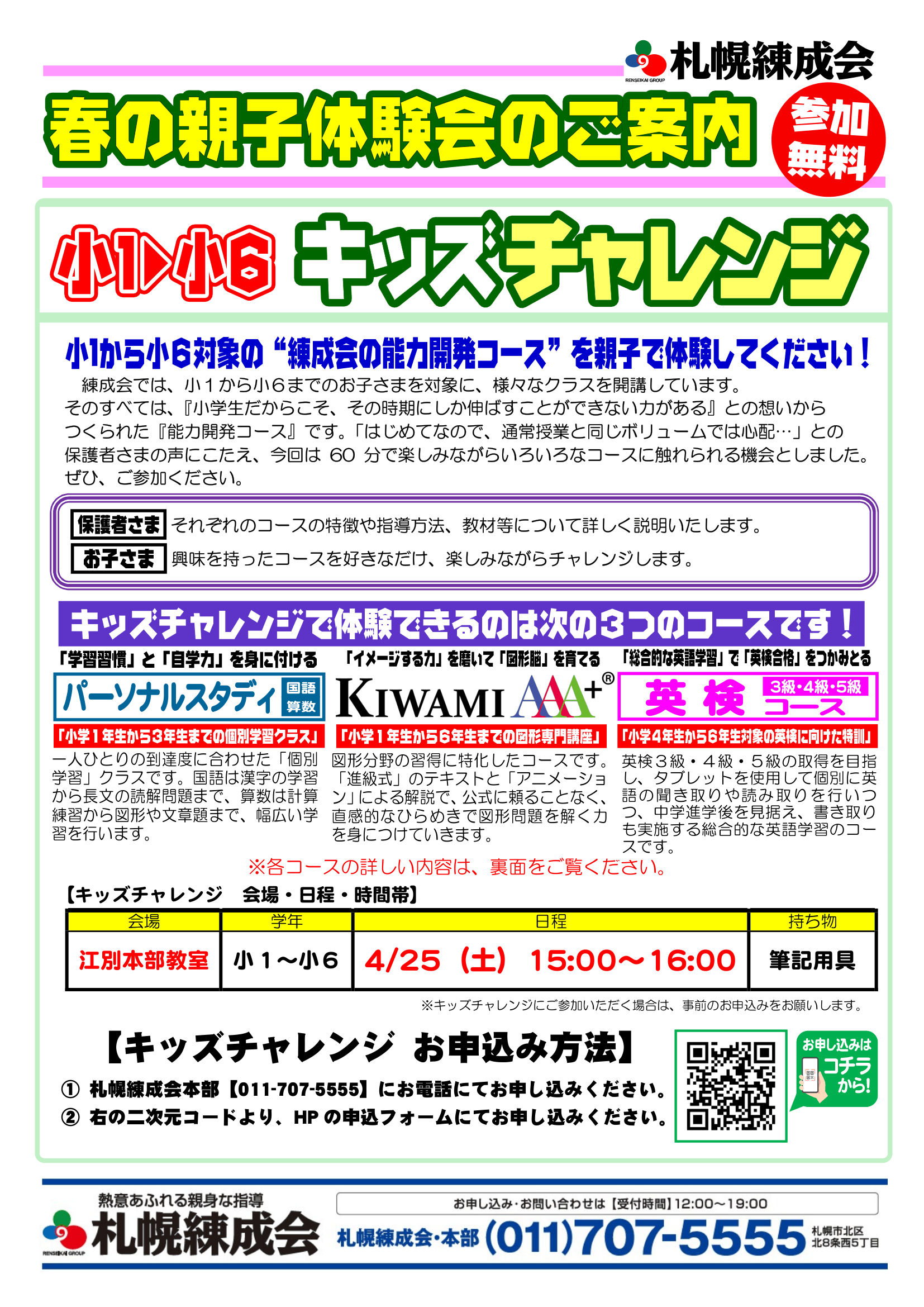 今回は、4/25()15:00~16:00に親子体験会を実施します。