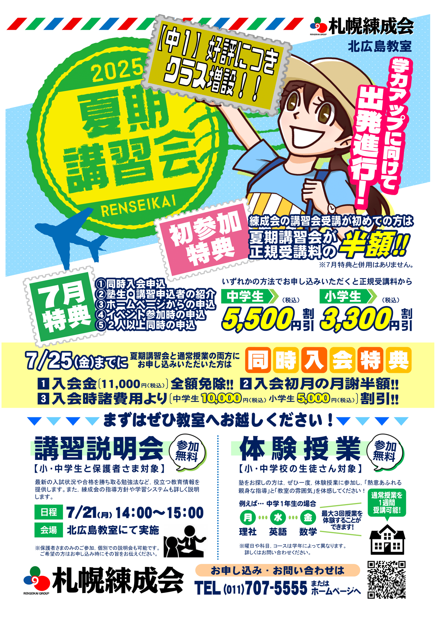 今年の夏期講習会では、中学1年生の申し込みが予想を上回り、大変うれしい反響をいただいております。