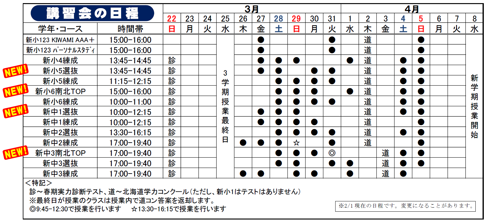 春期講習会 開講クラスは新小1~新中3生まで開講!