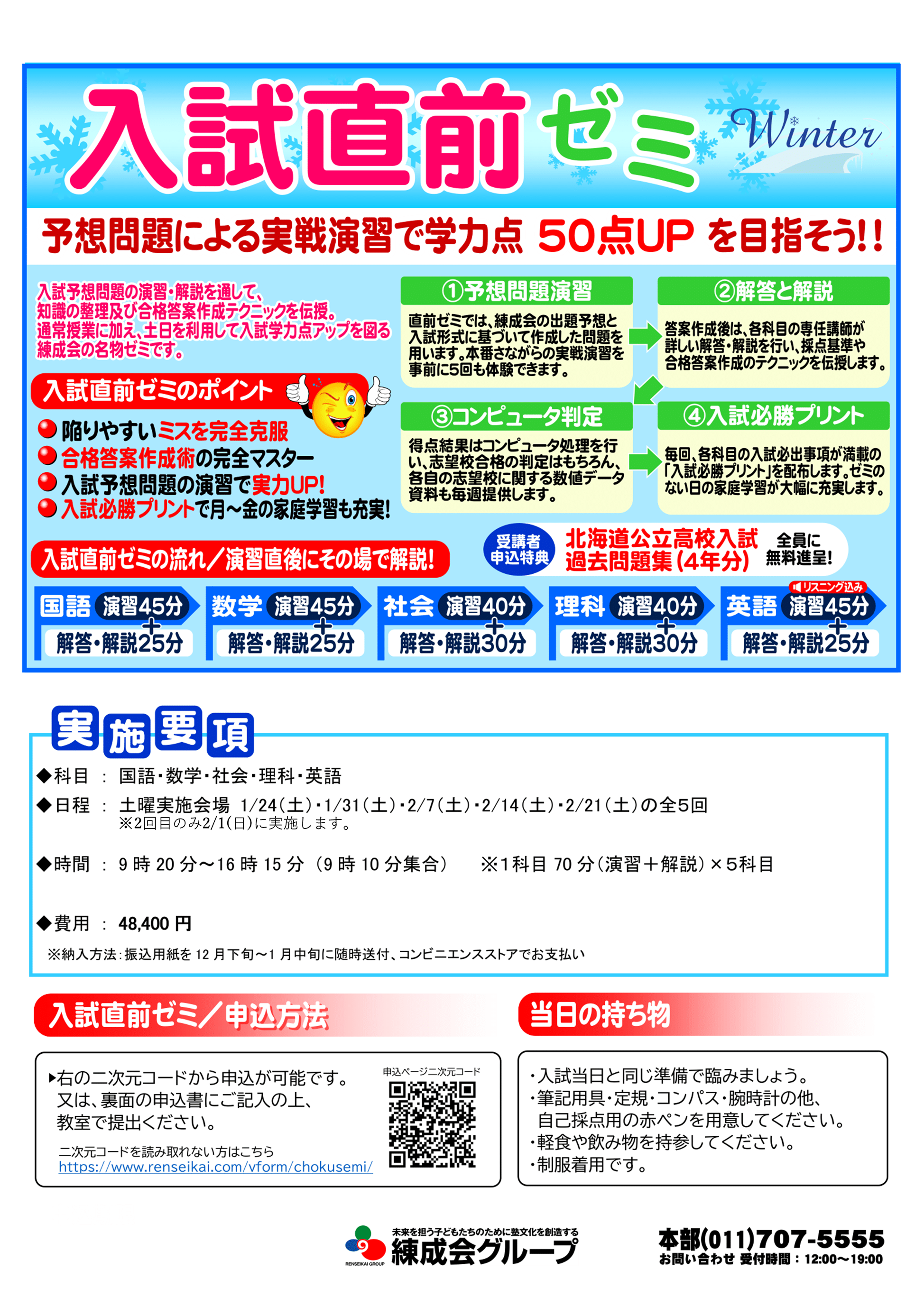 効率的に得点力を高めてコンディションをベストに調整したい中学3年生の皆さんに向けて、練成会北広島教室では 「入試直前ゼミ」 を実施します。