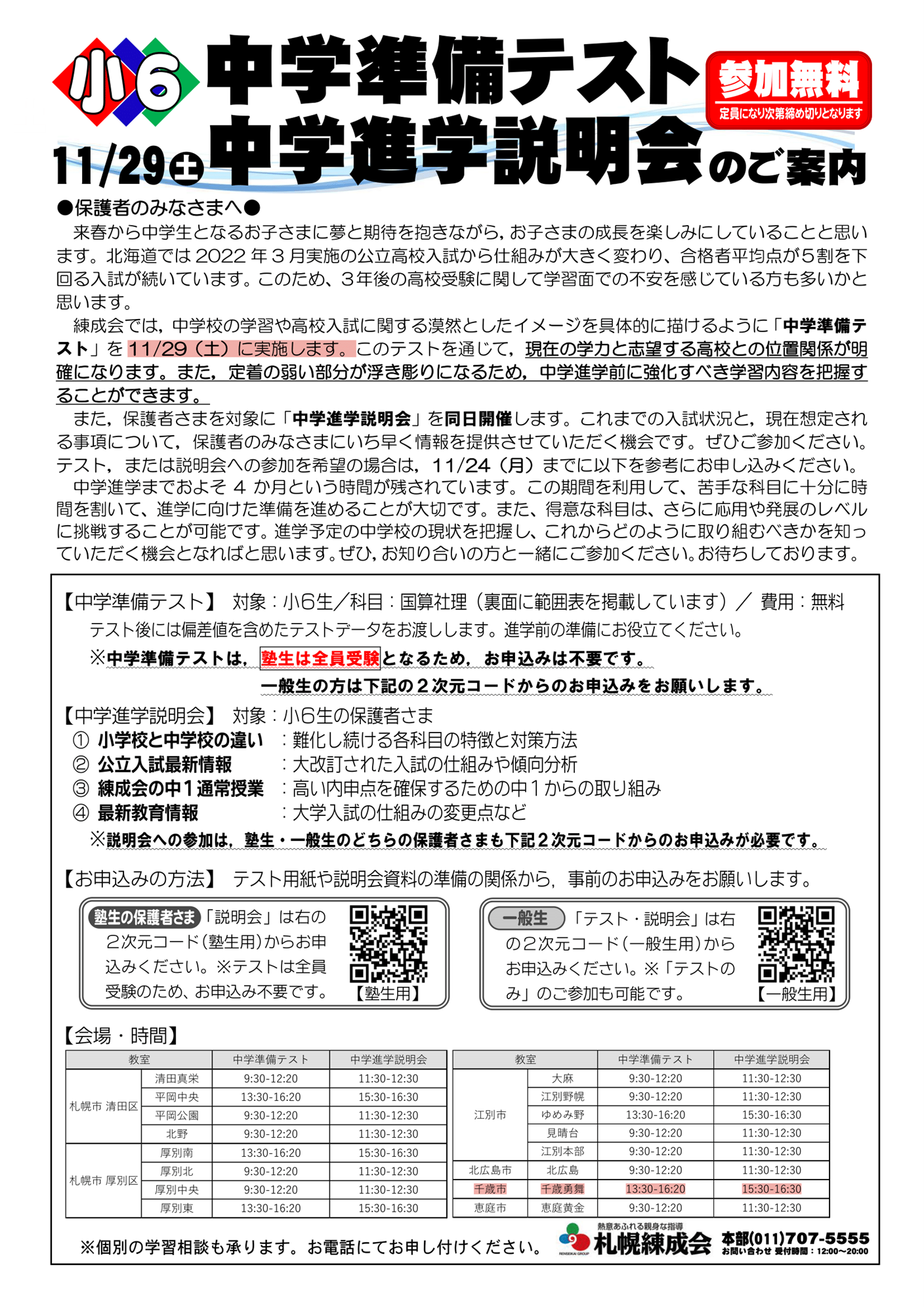 そこで、お子さま向けに「中学準備テスト」を、そして保護者さま向けに「中学進学説明会」をご用意いたしました。