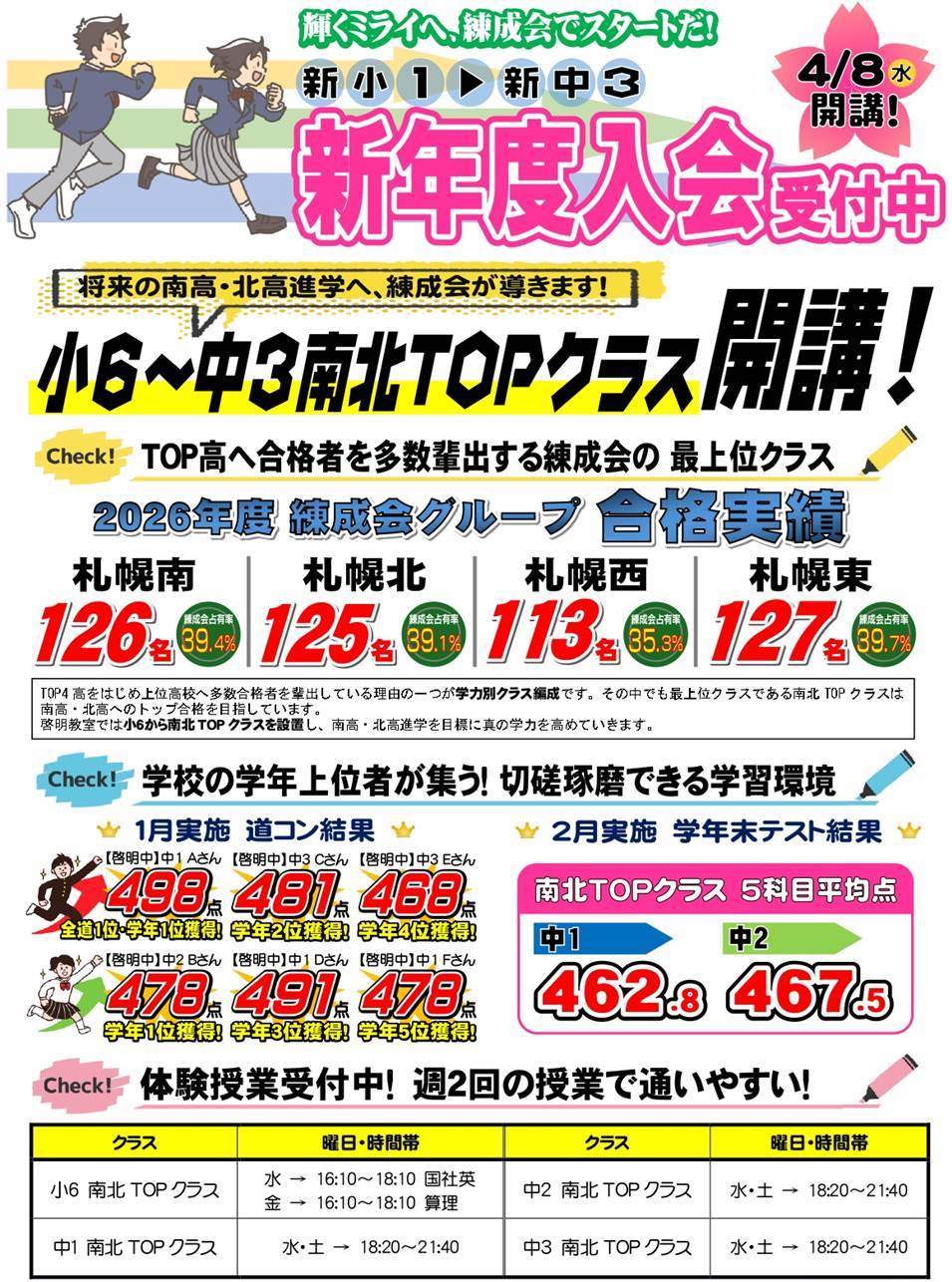 新小6~新中3南北TOPクラス開講!新年度入会は今なら2大特典!(啓明教室)