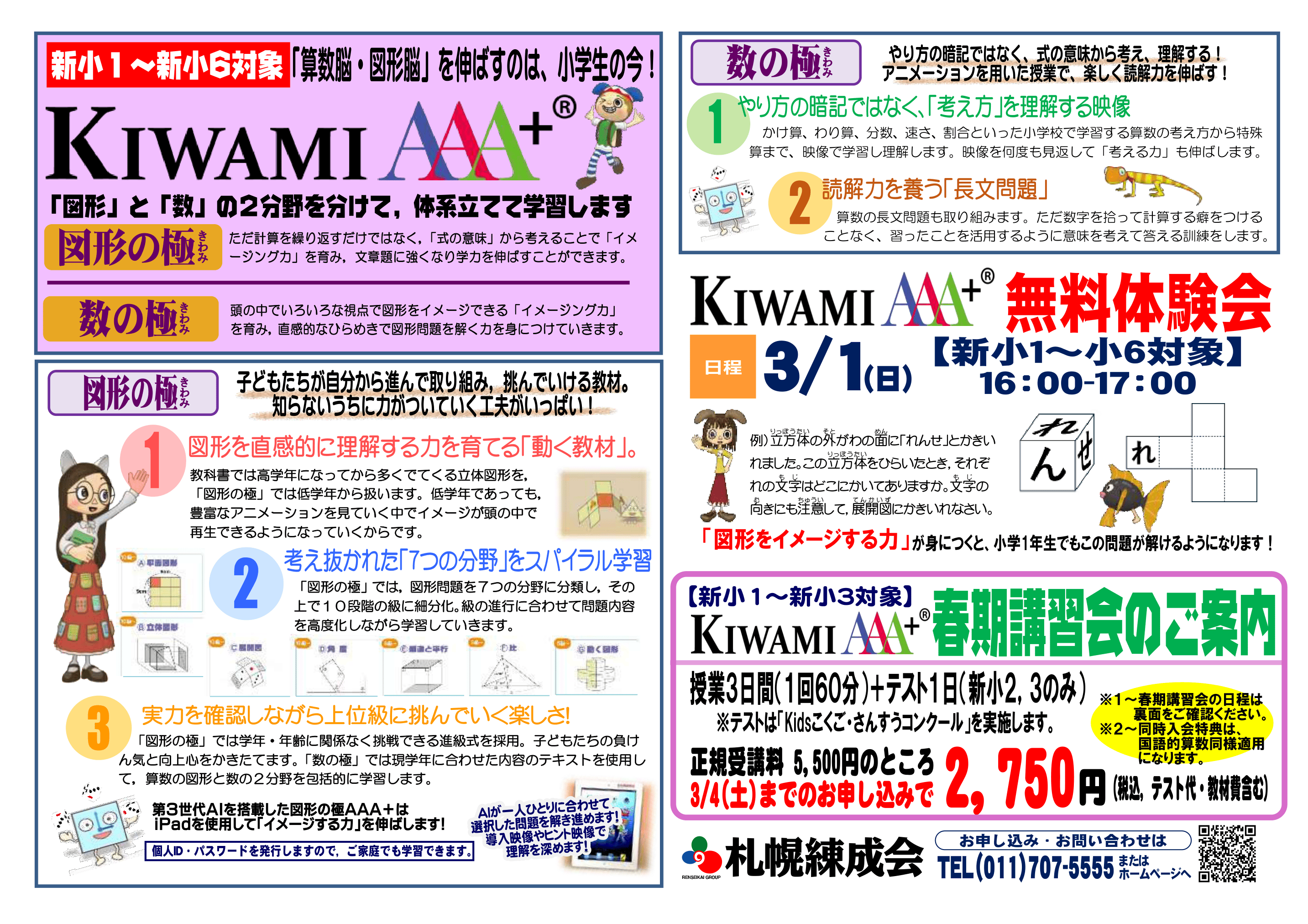 平岡公園教室では玉井式国語的算数 / KIWAMI AAA+を開講しています。