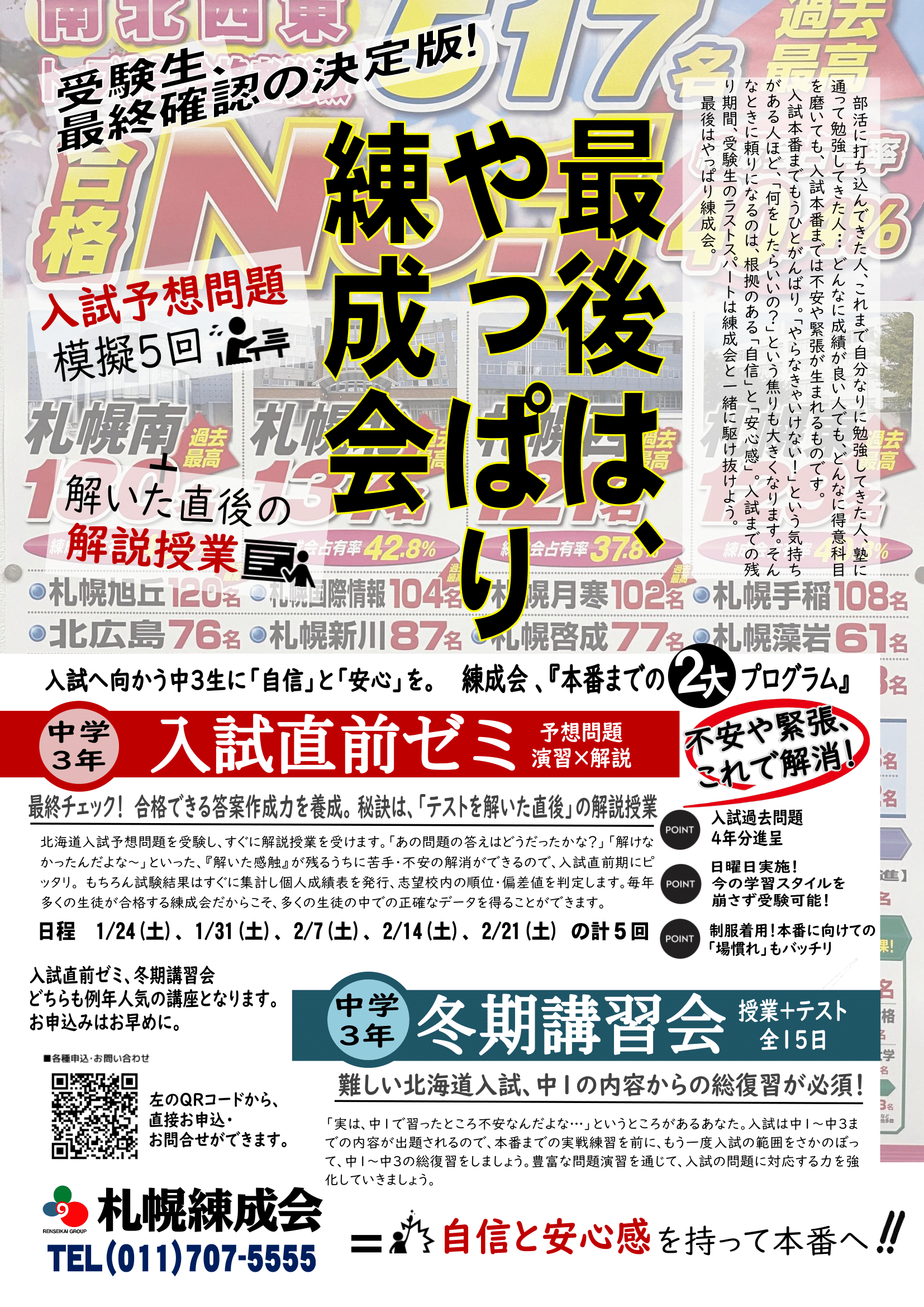 ➀「入試直前ゼミ」と➁「冬期講習会」のご案内です。