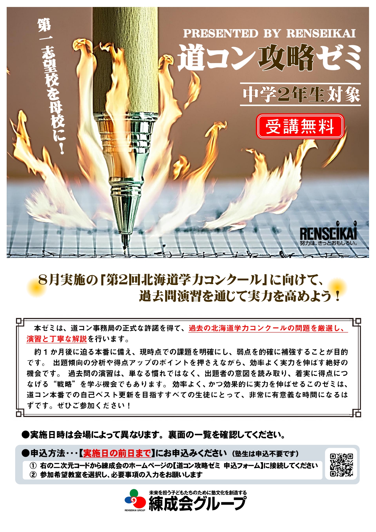 漢字・計算コンクール&道コン攻略ゼミ(中2対象)のご案内(手稲東教室)
