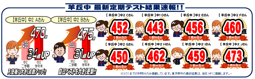 本日は羊丘中の学年末テスト結果速報!