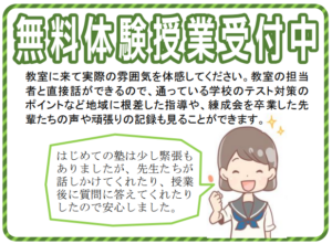 教室の授業や雰囲気を実際に確かめたい方は是非「無料体験」へお申込みください。