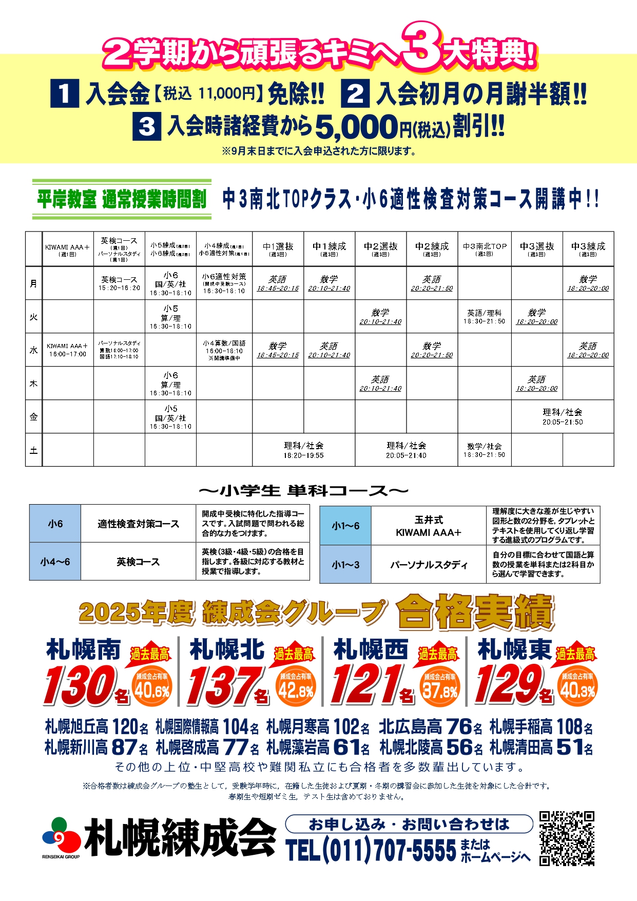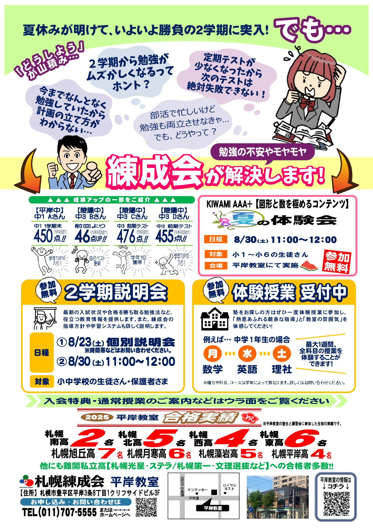 中の島中 定期テスト対策授業のご案内(平岸教室)