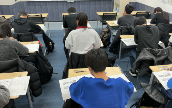 中3生たち(写真)は公立高校入試と同じ50分×5科目のテスト。