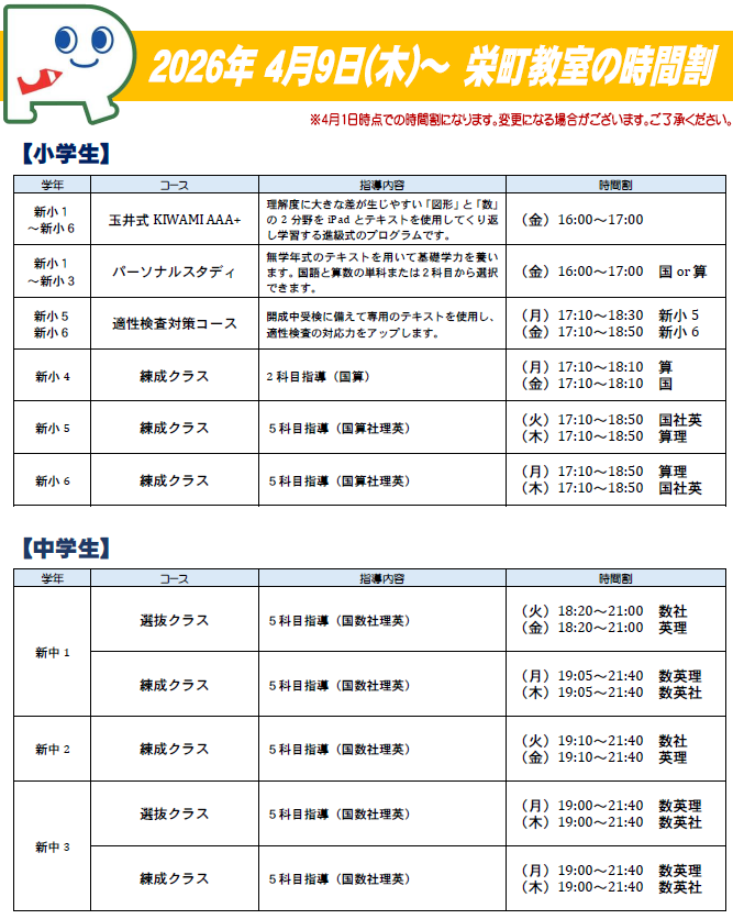 ☞ 栄町教室 時間割データはこちらからもご覧いただけます。