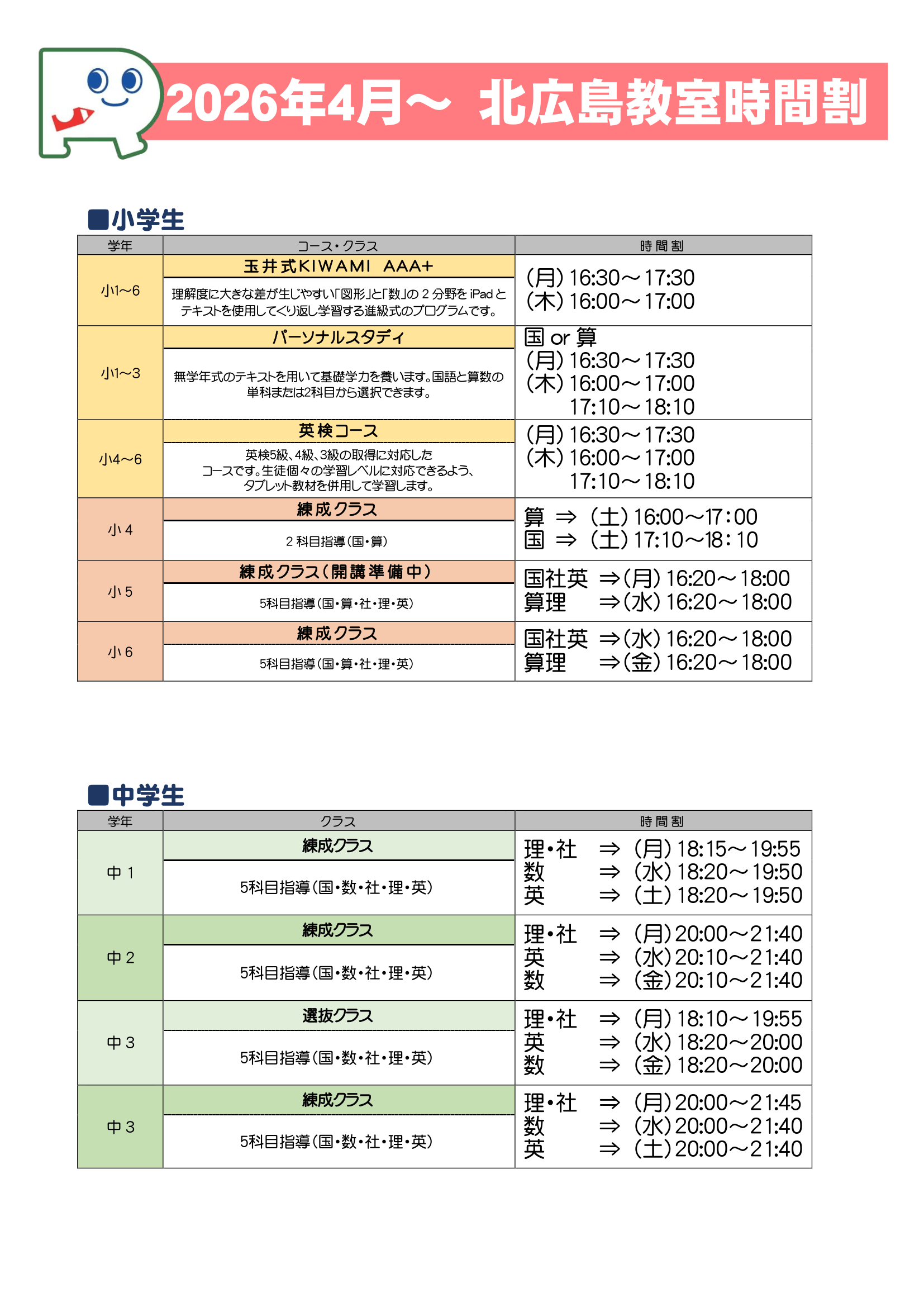 - 新年度通常授業のお知らせ(北広島教室)