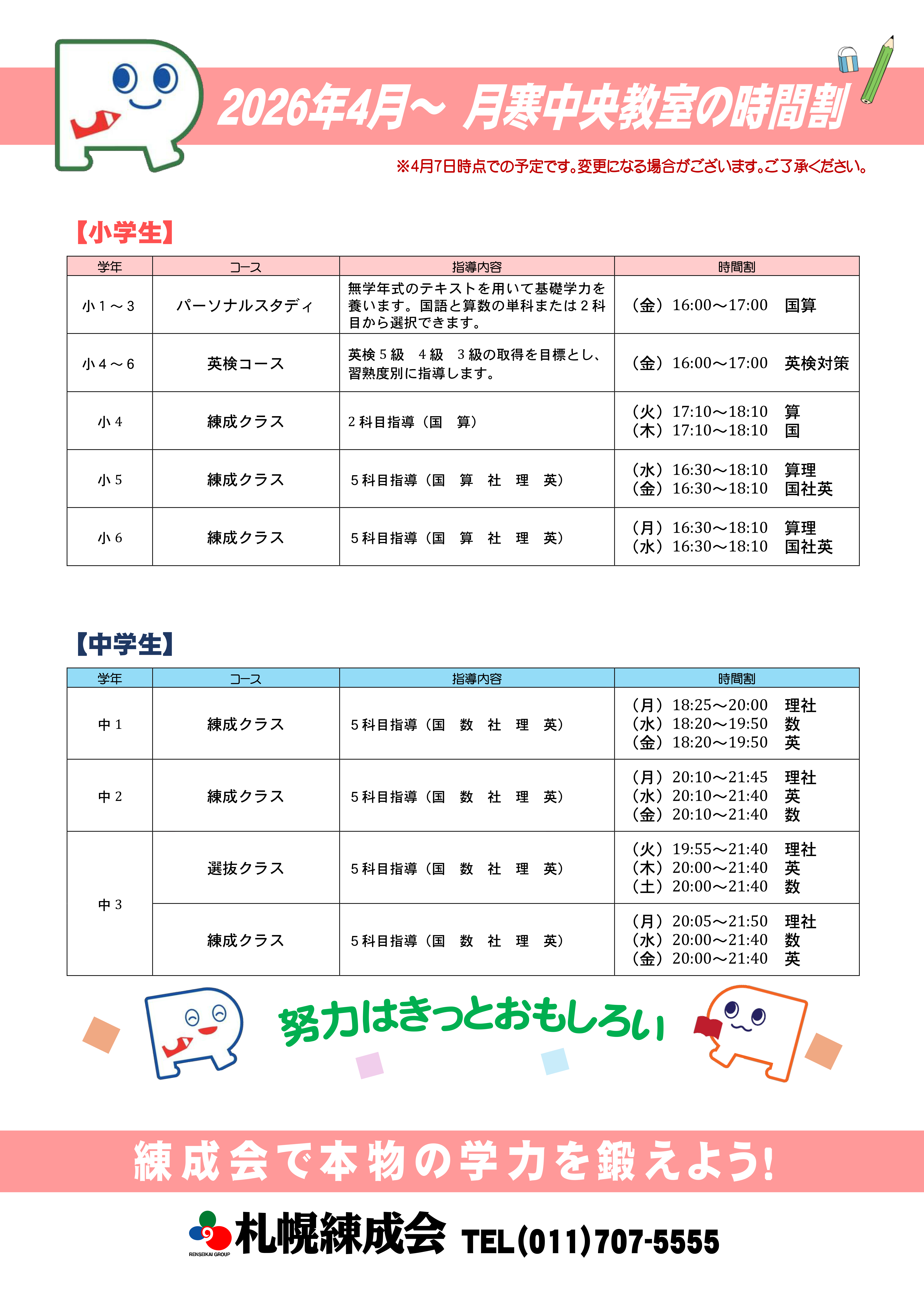 - 新年度通常授業のお知らせ(月寒中央教室)