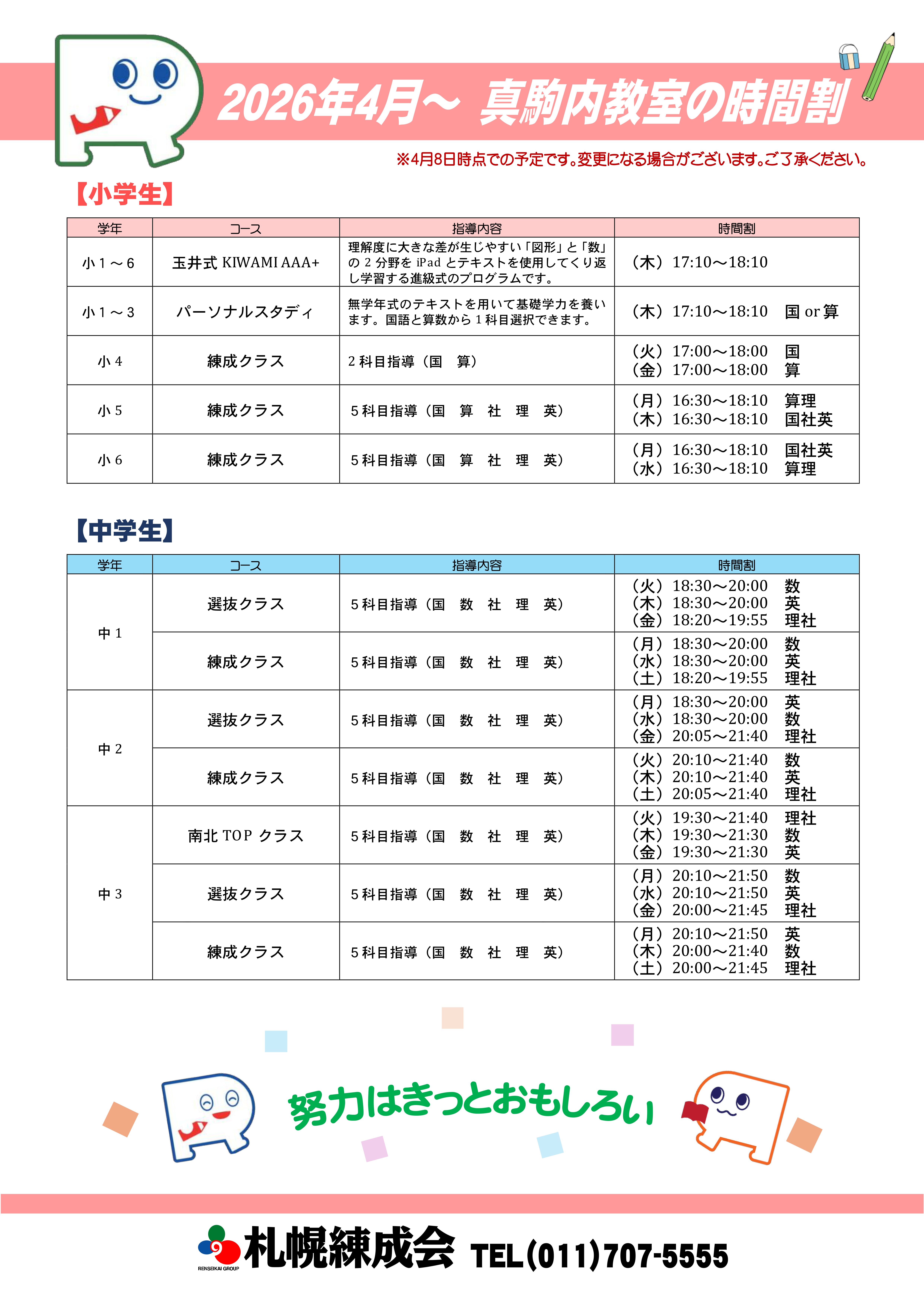 真駒内教室は、ミュークリスタルビルの2Fにあります。塾生は真駒内中、真駒内曙中、常盤中、真駒内桜山小、真駒内公園小のみなさんが中心ですが、地下鉄駅やバス停の近くということもあり、澄川・石山・藻岩地区からも通ってくれています。