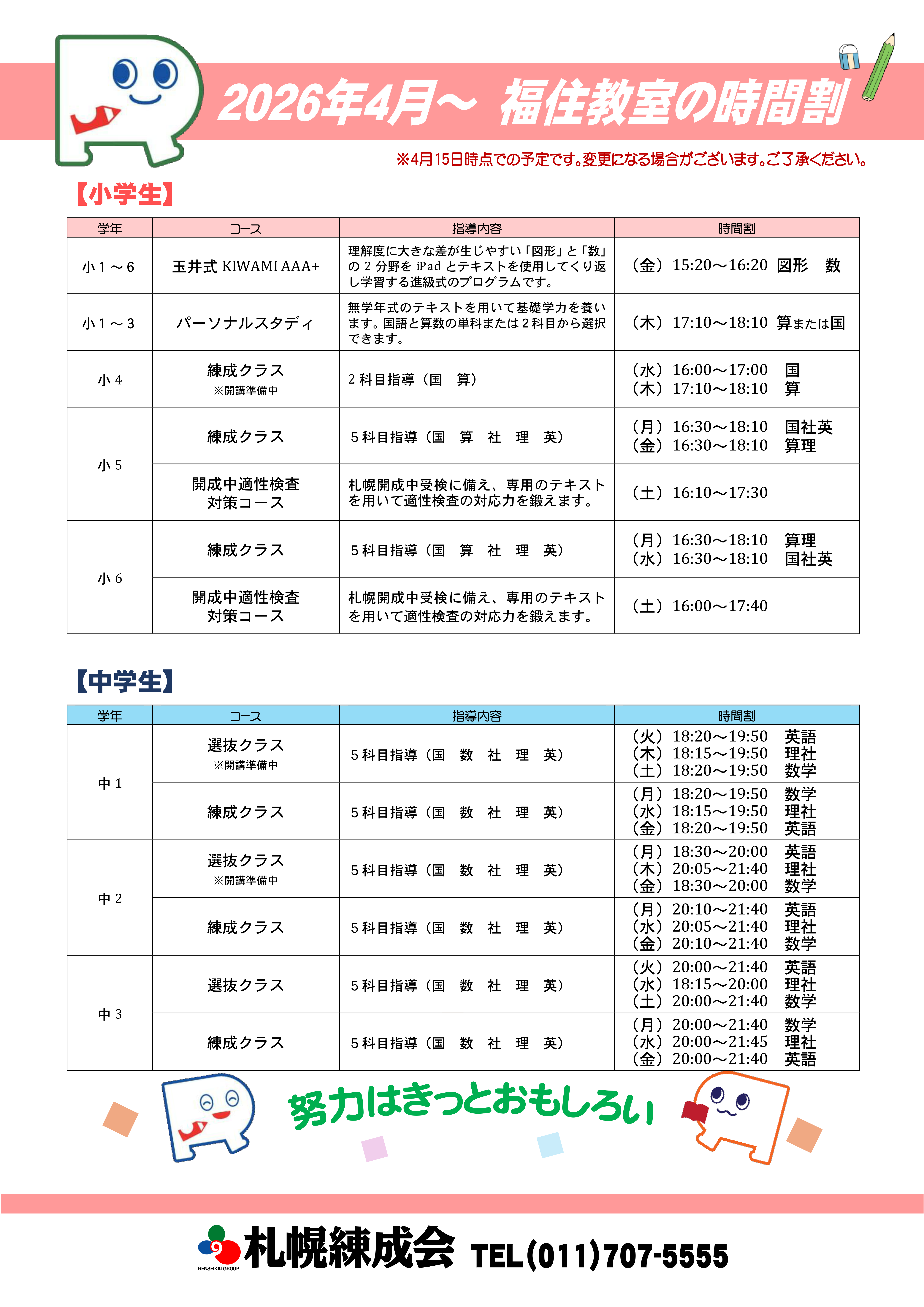 - 新年度通常授業のお知らせ(福住教室)