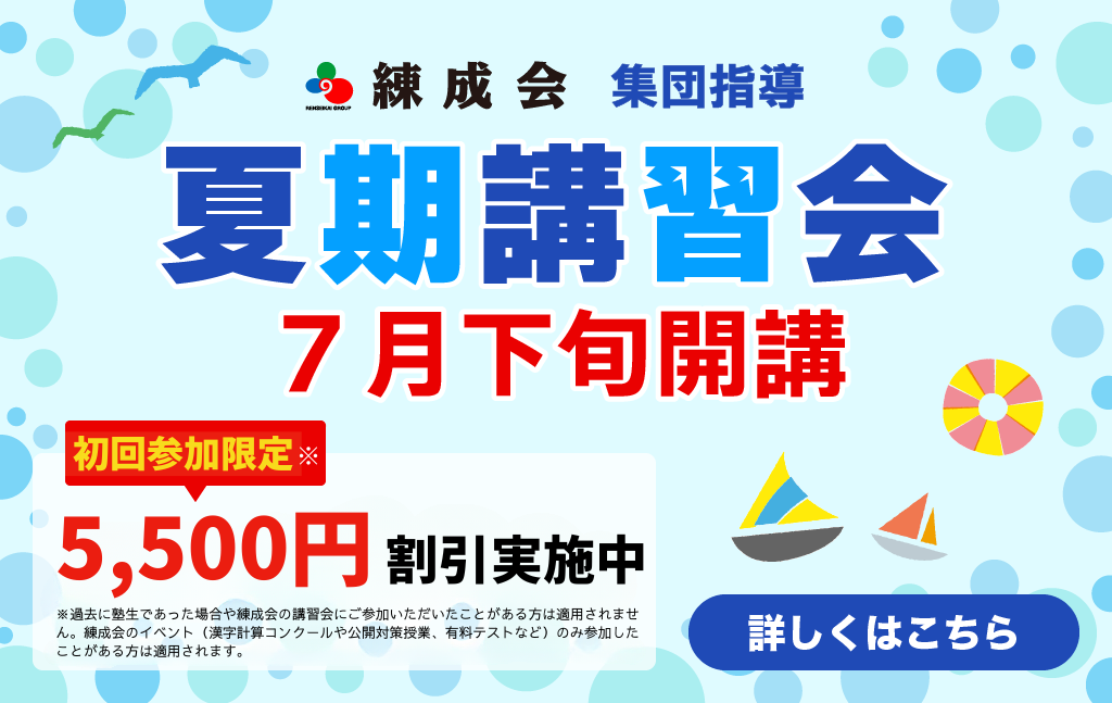 お知らせ INFORMATION 2025/11/08 ニュース 小学生 中学生 高校生 【共育ラボ】無意識にNGワード言ってない?子どもの夢を守る声かけ術 2025/11/07 イベント 小学生 【年長-小6】11月|パズル道場・親子無料体験会のご案内 2025/11/07 イベント 小学生 【小1-小6】11月|伸びる子になる!「サットン 算数・国語」本質的な学習にアプローチ!無料体験受付中! もっとみる 授業のご紹介 COURSE 小学生 中学生 高校生 教室のご案内 SCHOOLS 滝川練成会 本校 滝川練成会 深川スクール 東進衛星予備校 滝川明神町校 教室案内 実績 RESULTS 小学生 中学生 高校生 塾生・保護者の声 VOICE 練成会【集団指導】 東進衛星予備校 よくある質問 無料体験