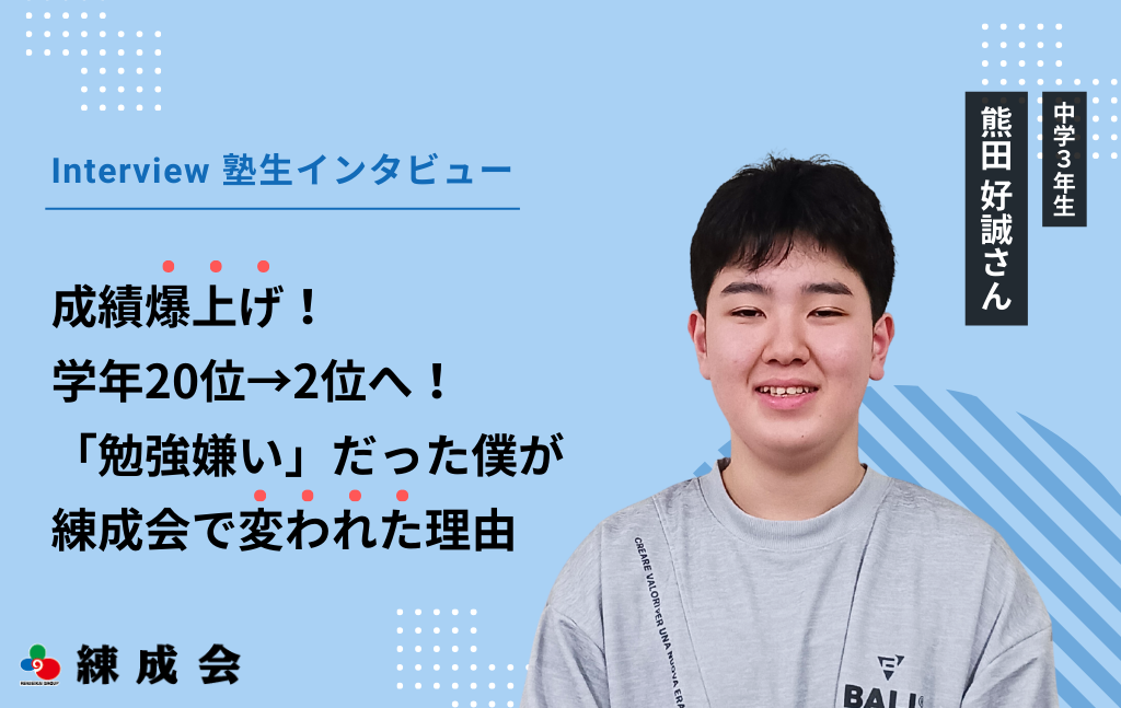 塾生インタビュー⑤|成績爆上げ!学年20位→2位へ!「勉強嫌い」だった僕が練成会で変われた理由(中3 熊田 好誠さん)
