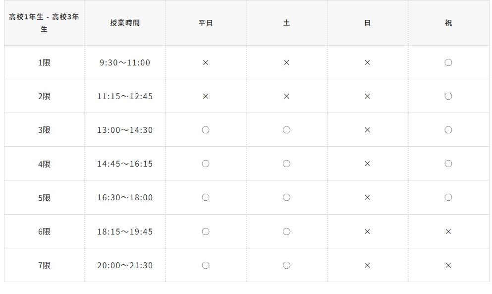 | 火・水・金 | ① 16:50~17:40 ② 17:50~18:40 ③ 18:50~19:40 ④ 19:50~20:40 ⑤ 20:50~21:40 |
