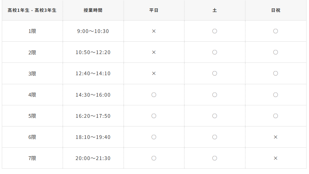 | 月・火・水・木 | ① 16:50~17:40 ② 17:50~18:40 ③ 18:50~19:40 ④ 19:50~20:40 ⑤ 20:50~21:40 |
